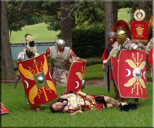 The men are stunned as their Legate falls to a javelin.